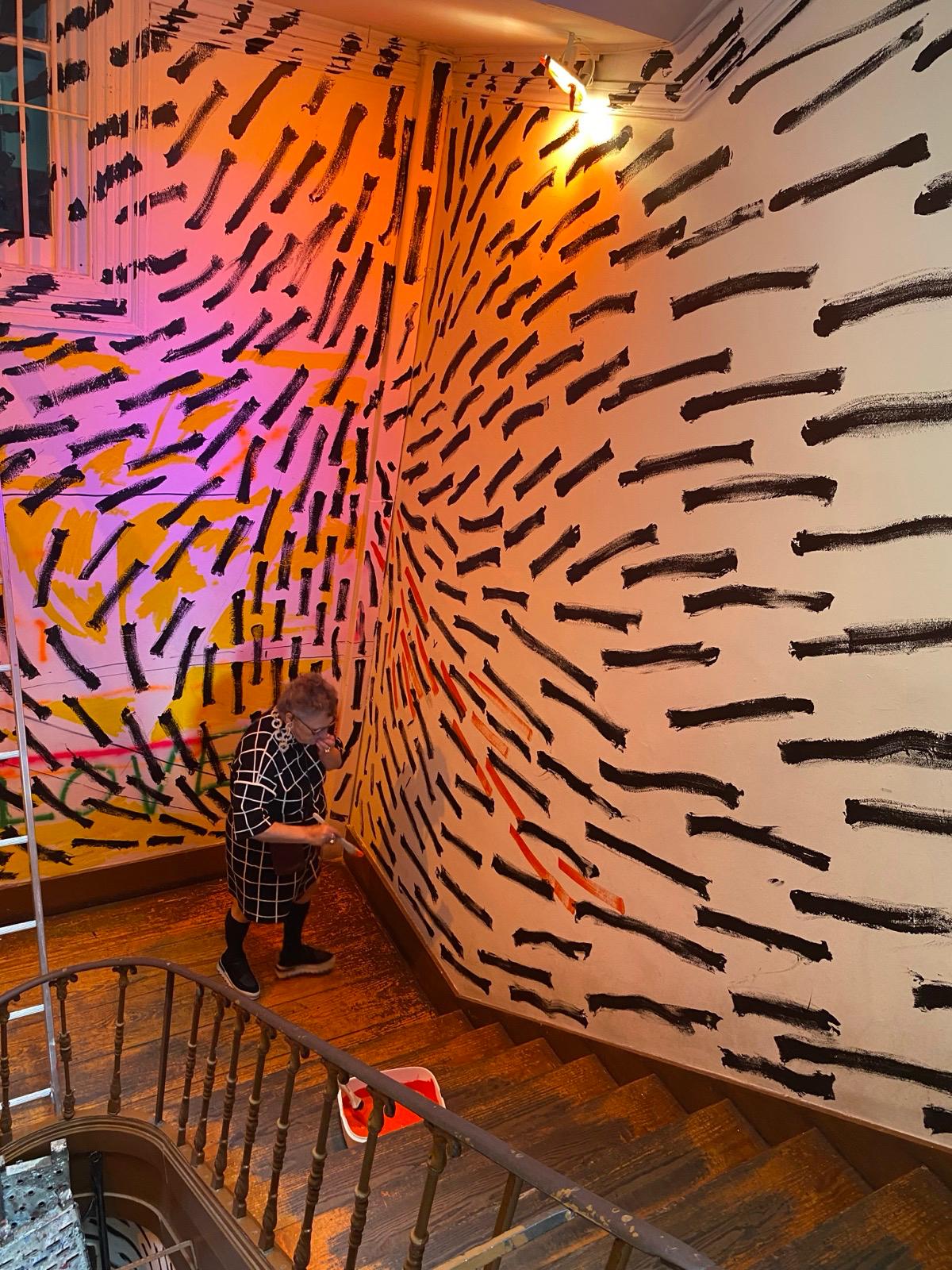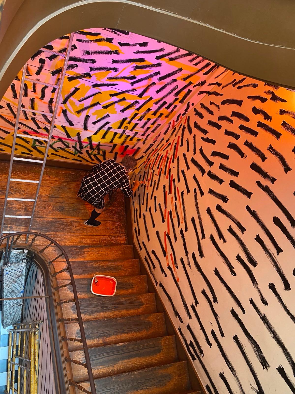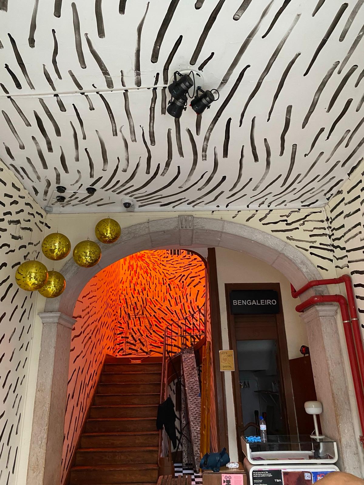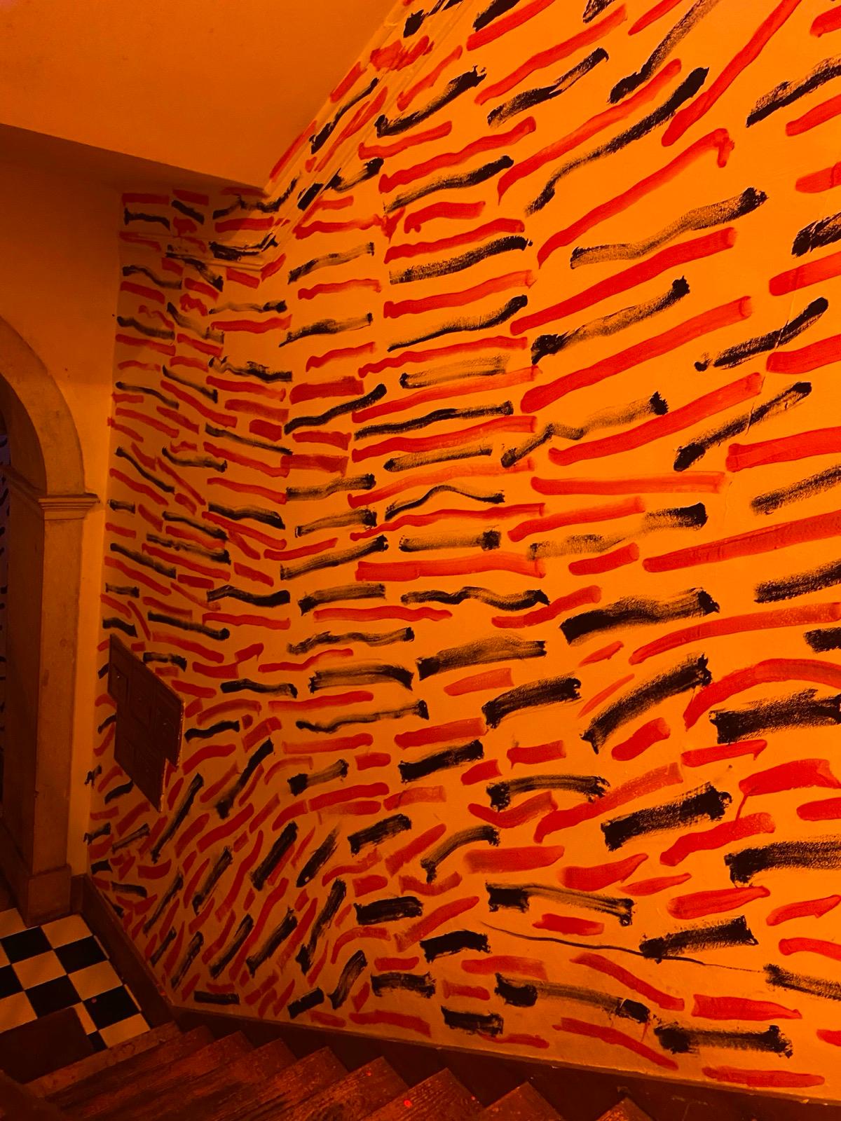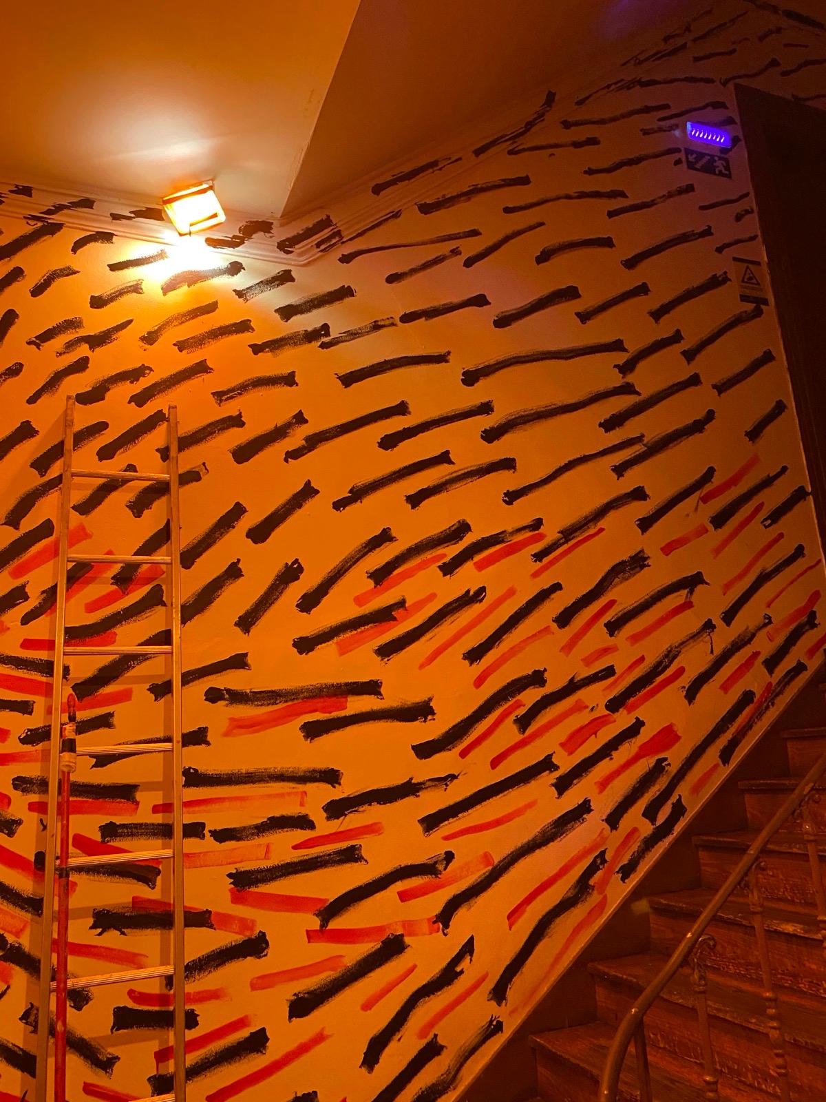 O mural, composto por pintas e traços que, isoladamente, são pequenos elementos mas que, em conjunto, constroem uma imagem maior, espelha o modo como a Casa Independente acolhe e faz convergir pessoas, práticas e projetos. Representa a resiliência e a resistência cultural que definem a Casa no panorama lisboeta, ao mesmo tempo que evoca a passagem do tempo, as memórias e o legado que aqui se constroem — sempre com o olhar voltado para o futuro, tal como as “pingas” que avançam e se transformam no seu curso natural.